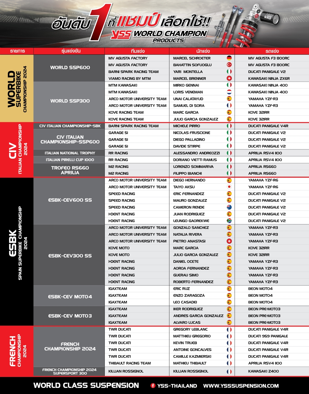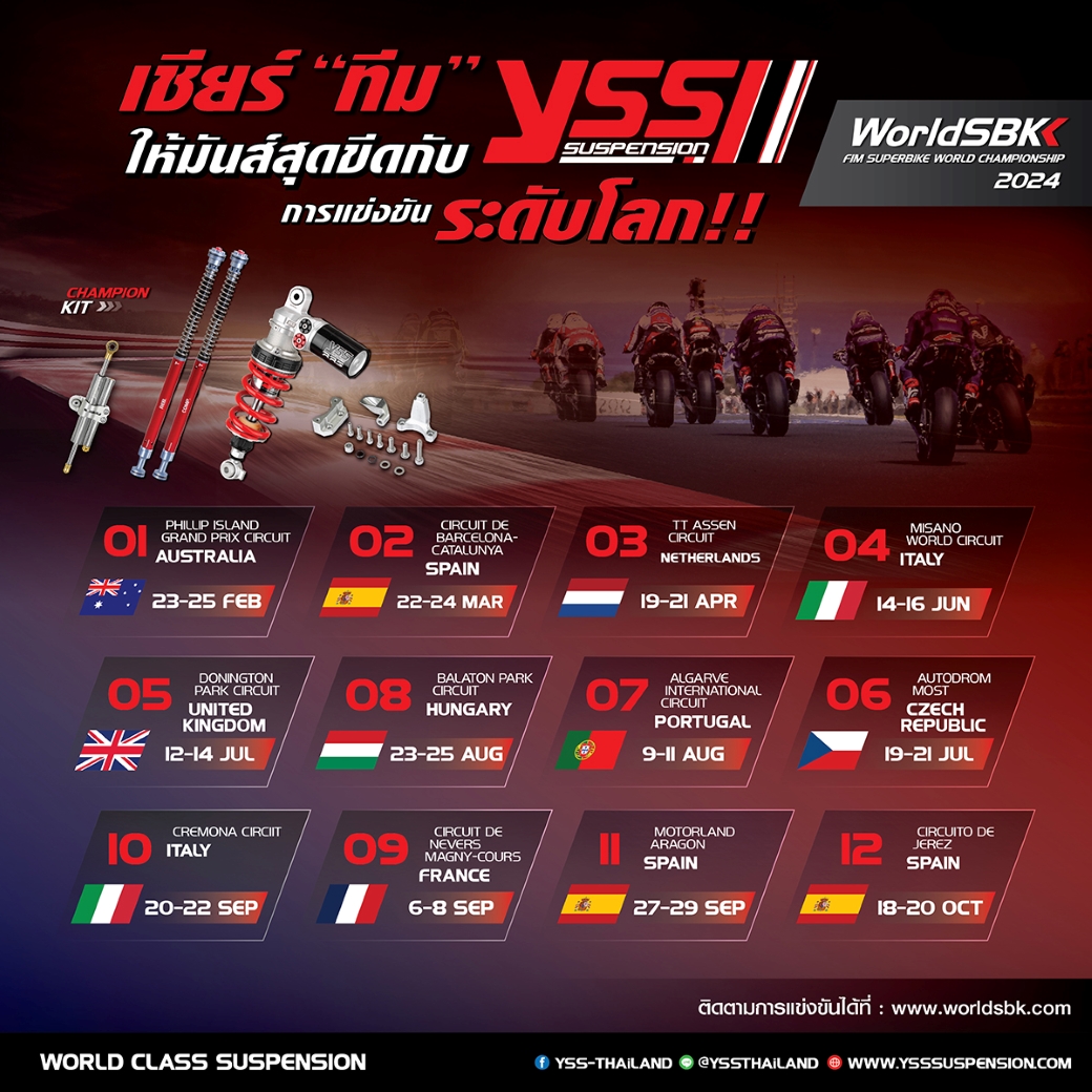นอกจากรายการ World Superbike Championship 2024 เเล้ว YSS SUSPENSION ยังได้เข้าร่วมรายการเเข่งขันอีกมากมายไม่ว่าจะเป็น