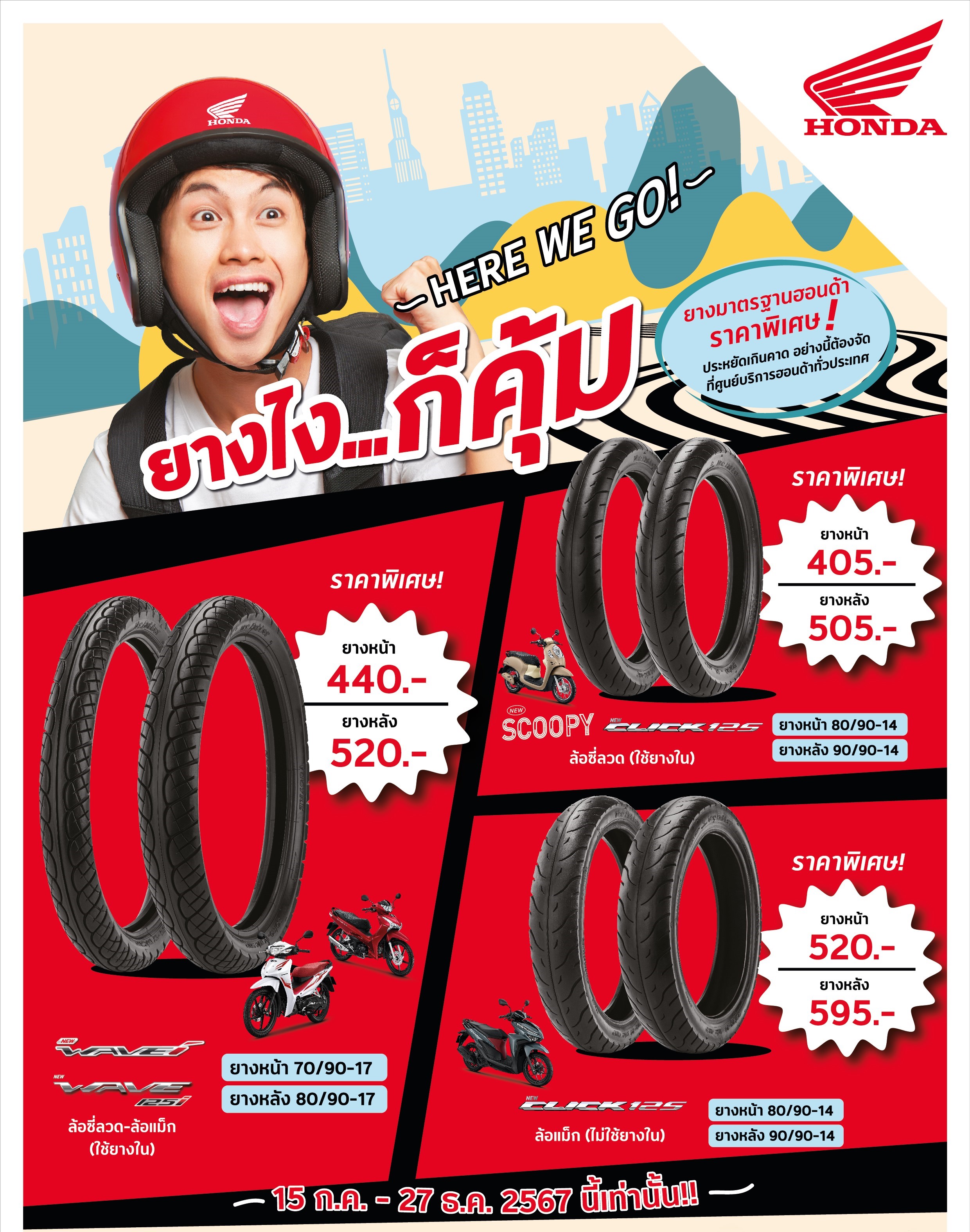 ไทยฮอนด้า ชวนผู้ขับขี่รถจักรยานยนต์ ตรวจเช็กสภาพยาง เพื่อช่วยลดอัตราการเกิดอุบัติ เหตุในช่วงหน้าฝน พร้อมมอบโปรโมชันและราคาพิเศษสุ ดคุ้มสำหรับผู้ที่ต้องการเปลี่ ยนยาง โดยมอบความคุ้มยาวๆ ตั้งแต่ วันที่ 17 กรกฎาคม– 27 ธันวาคม นี้
