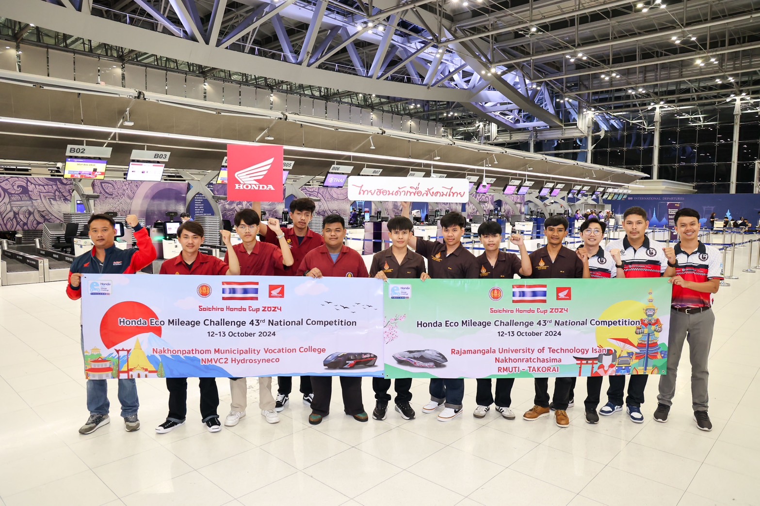 สำหรับทีมเยาวชนไทยทั้ง 2 ทีมที่ไทยฮอนด้า เป็นผู้สนับสนุนในการเข้าร่ วมการแข่งขันครั้งนี้ ก็คือ ทีม ‘NMVC 2’ จากวิทยาลัยอาชีวศึ กษาเทศบาลนครปฐม แชมป์จากระดับอาชีวศึกษา และทีม ‘ตะโกราย.2’ จากมหาวิทยาลัยเทคโนโลยี ราชมงคลอีสาน นครราชสีมา แชมป์จากระดับอุดมศึกษา ซึ่งเป็น 2 ทีมที่สามารถทำคะแนนได้สูงสุ ดในรายการแข่งขัน Honda Eco Mileage Challenge 2024 ของไทยเมื่อต้นปีที่ผ่านมา โดยการแข่งขันนี้จัดขึ้นภายใต้ โครงการ ‘ไทยฮอนด้าเพื่อสังคมไทย’ ที่มุ่งเน้นการพัฒนาศั กยภาพเยาวชน ควบคู่กับการสร้างจิตสำนึ กในการอนุรักษ์พลังงาน