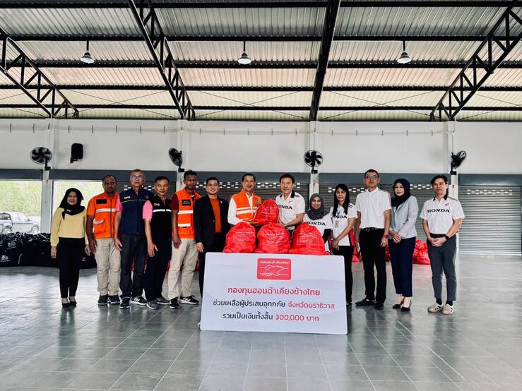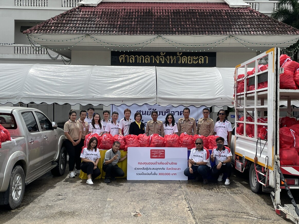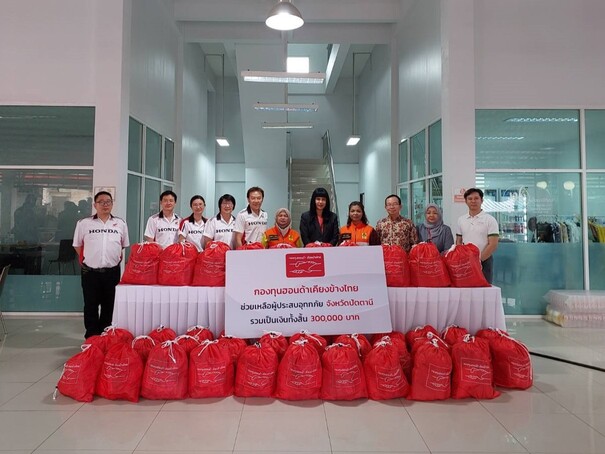 กองทุนฮอนด้าเคียงข้างไทย ภายใต้มูลนิธิฮอนด้าประเทศไทย ผนึกกำลังตัวแทนผู้จำหน่ ายรถยนต์และรถจักรยานยนต์ฮอนด้า ร่วมใจช่วยเหลือผู้ประสบอุทกภั ยในพื้นภาคใต้ 4 จังหวัด ได้แก่ สงขลา ยะลา ปัตตานี และนราธิวาส โดยส่งมอบถุงยังชีพไปแล้วกว่า 2,400 ถุง รวมมูลค่าความช่วยเหลือทั้งสิ้น 1.2 ล้านบาท และจะทยอยเข้าช่วยเหลืออย่างต่ อเนื่องในจังหวัดชุมพร สุราษฎร์ธานี นครศรีธรรมราช และพื้นที่ประสบอุทกภัยและได้รั บความเดือดร้อนต่อไป