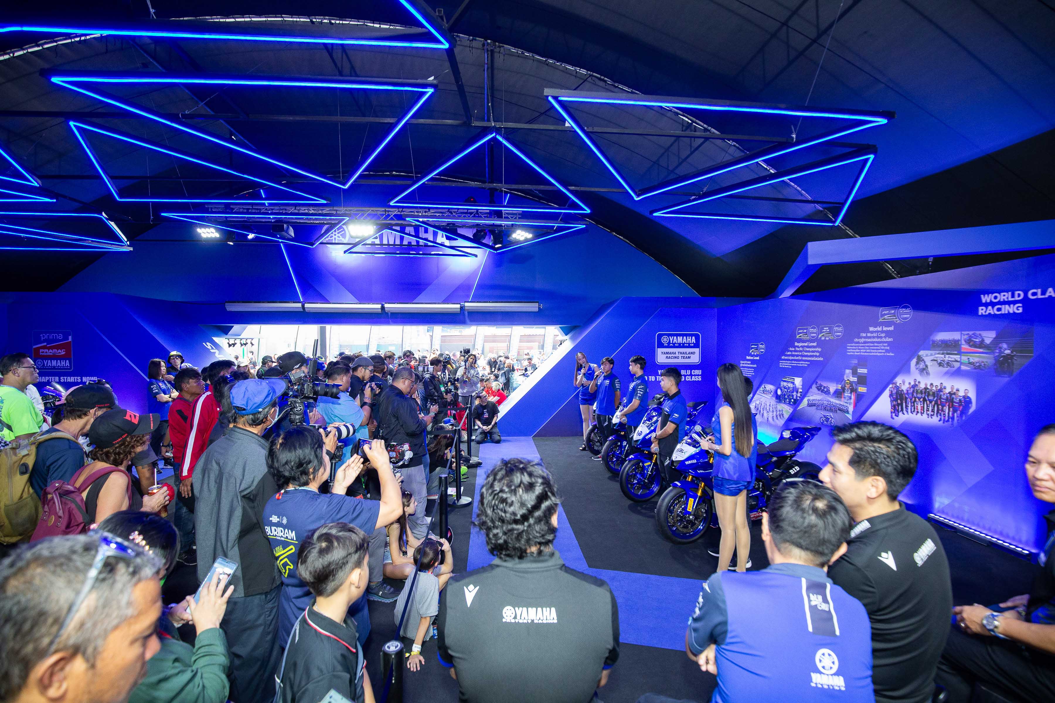 นายพงศธร เอื้อมงคลชัย ประธานกรรมการบริหาร นายภาณุพล กิตติคำรณ ผู้จัดการใหญ่ด้านการค้า นายอุกฤษณ์ ภาควิวรรธ รองผู้จัดการใหญ่ด้านวางแผนการค้า และการตลาด นายกัมพล พรสูงส่ง รองผู้จัดการใหญ่ด้านขาย บริการ และอะไหล่ บริษัท ไทยยามาฮ่ามอเตอร์ จำกัด ถ่ายรูปร่วมกับ 4 นักแข่งในสังกัด ยามาฮ่า ไทยแลนด์ เรซซิ่งทีม นำโดย ตี อนุภาพ ซามูล - ไอเดีย กฤตภัทร เขื่อนขำ 2 นักแข่งยามาฮ่า ที่เคยลุยศึกเวิลด์ซูเปอร์ไบค์ ควง 2 ดวงรุ่งจาก YAMAHA R3 BLU CRU Asia-Pacific ฟลูมูน พศิน ชมพูรัตน์ และ อาร์ตี้ ธนกฤต ประทุมทอง ในกิจกรรม มีทแอนด์กรี๊ด กระทบไหล่ 4 นักแข่งไทยที่มาร่วมกิจกรรมในครั้งนี้ โดย 4 นักแข่งดาวรุ่งไทยนำของรางวัล มาแจกให้กับเหล่าสาวกยามาฮ่าอย่างมากมาย