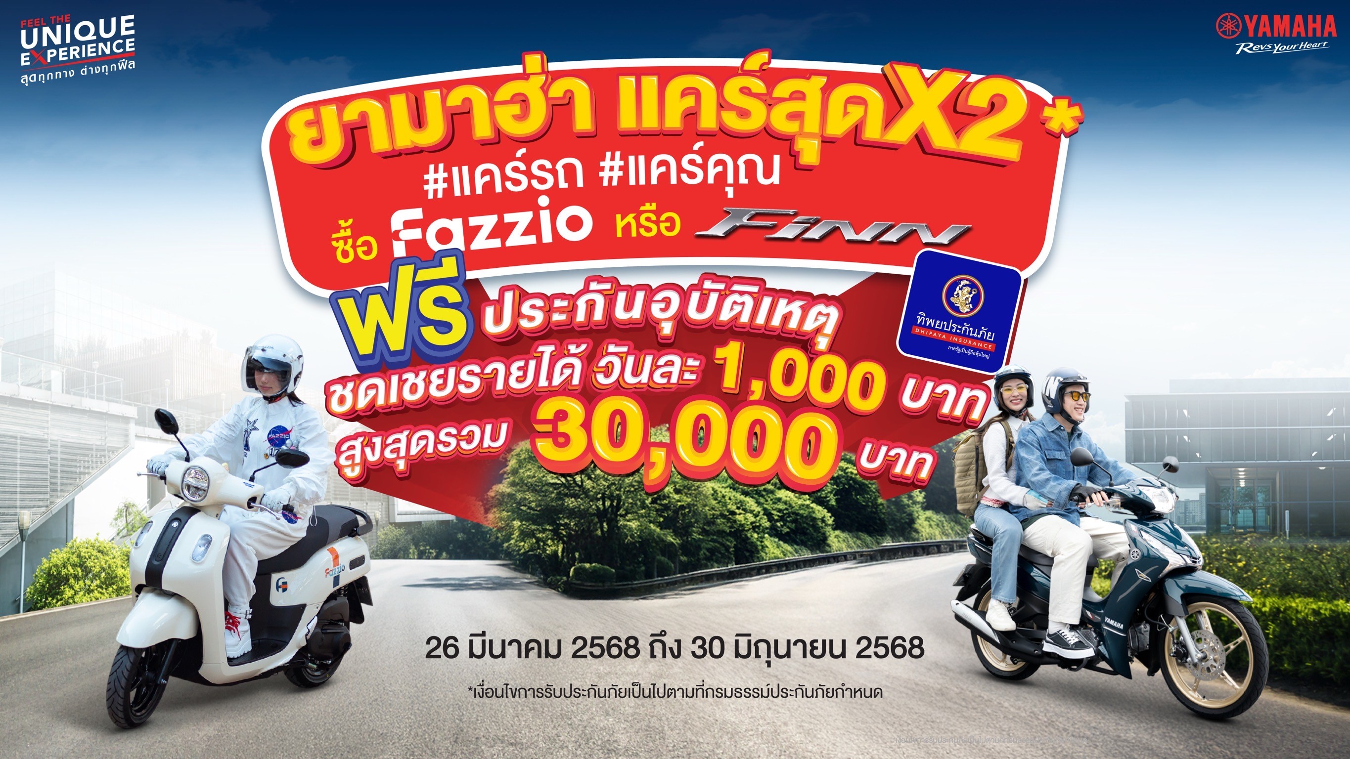 ยามาฮ่ามอบความมั่นใจในทุกการเดินทางร่วมมือกับพันธมิตรทิพยประกันภัย จัดแคมเปญ “แคร์สุดx2” มอบประกันอุบัติเหตุ พร้อมชดเชยรายได้สูงสุดรวม 3 หมื่นบาทต่อปี #แคร์รถ #แคร์คุณ เมื่อซื้อยามาฮ่าฟาซซิโอ้ หรือยามาฮ่า ฟินน์ วันที่ 26 มีนาคม ถึง 30 มิถุนายน 2568