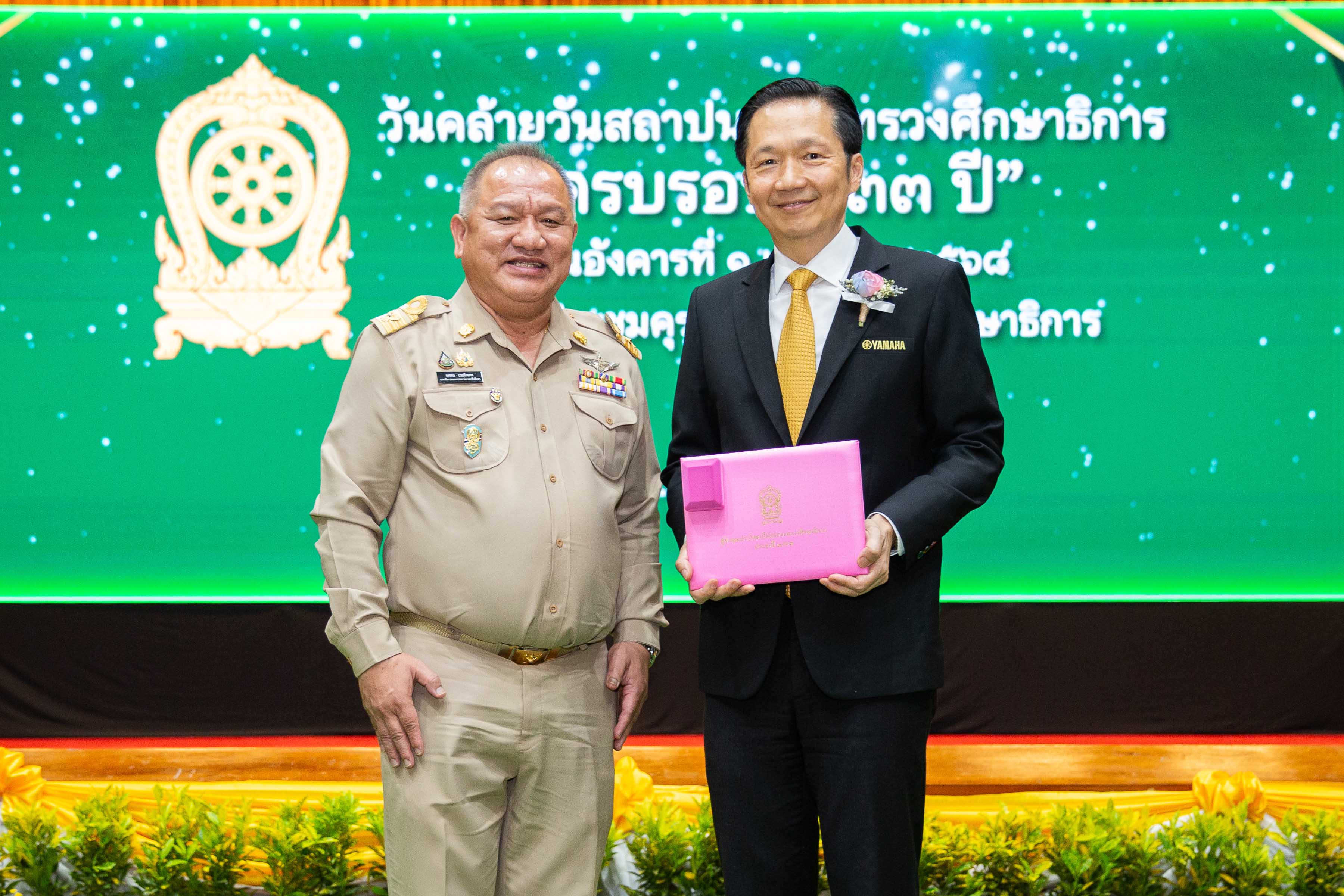 นายพงศธร เอื้อมงคลชัย ประธานกรรมการบริหาร บริษัท ไทยยามาฮ่ามอเตอร์ จำกัด ขึ้นรับรางวัลเข็มเสมาคุณูปการ และเกียรติบัตรผู้ทำคุณประโยชน์ให้กับกระทรวงศึกษาธิการ ประจำปี 2568 และถ่ายภาพร่วมกับ พล.ต.อ.เพิ่มพูล ชิดชอบ รัฐมนตรีว่าการกระทรวงศึกษาธิการ