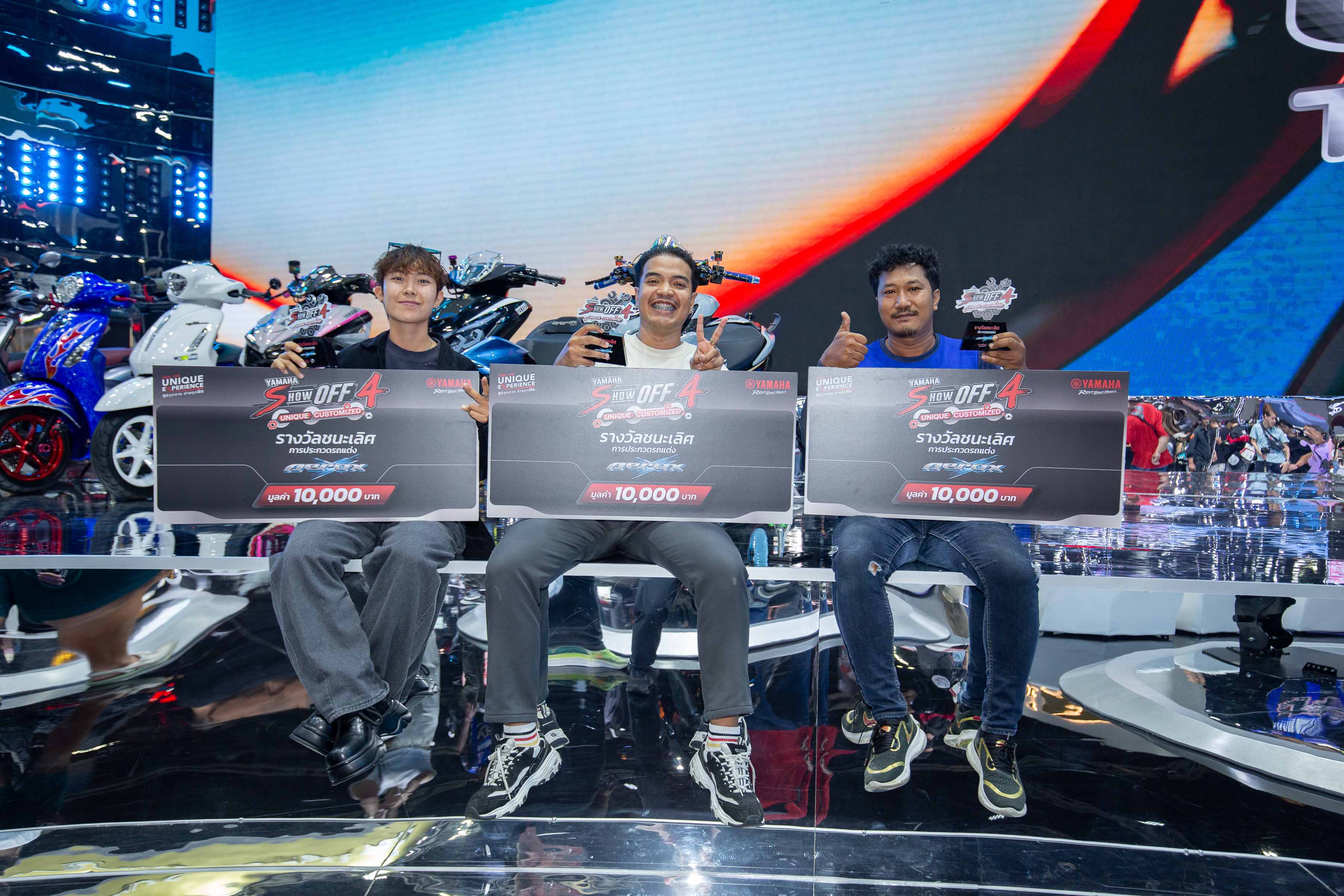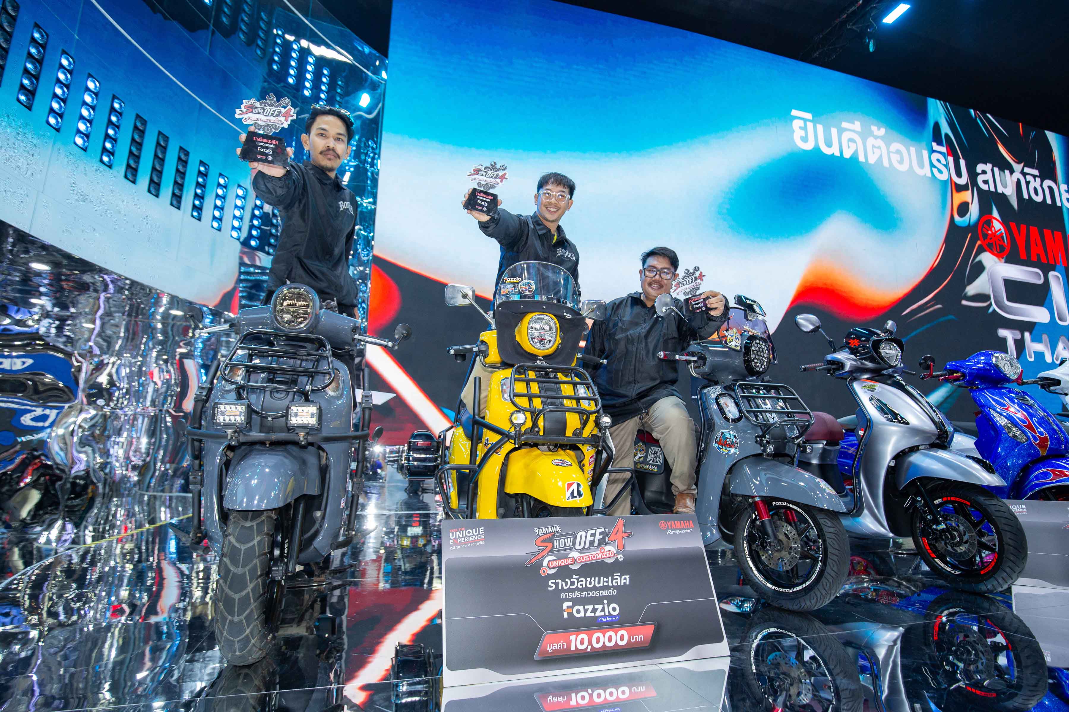 นายเค็น รุ่งเรือง ผู้จัดการกลุ่มงานวางแผนผลิตภัณฑ์ นางสาวรดี วรพงศ์ ผู้จัดการกลุ่มงานสื่อสารการตลาด นางสาวน้ำเพชร ตรีศักดิ์ศรีสกุล ผู้จัดการกลุ่มงานกิจกรรมการตลาด และสปอนเซอร์ชิพ บริษัท ไทยยามาฮ่ามอเตอร์ จำกัด ถ่ายภาพร่วมกับนายวันชัย เครือโชติ นายเมธี ลิขิตพันธกุล นายไพสิทธิ์ ตันติอายุรกิจ และนายชาญณรงค์ น้อยเอี่ยม พร้อมผู้ชนะการประกวดรถแต่งแห่งปี YAMAHA Show off ครั้งที่ 4 Unique – Customize ทั้ง 15 ท่าน ใน 5 รุ่นการแข่งขัน ได้แก่รุ่น YAMAHA FAZZIO, YAMAHA Grand Filano Hybrid, YAMAHA AEROX, YAMAHA NMAX และ YAMAHA XMAX จากการส่งเข้าประกวดผ่าน Facebook : YAMAHA Society Thailand โดยมีคณะกรรมการกิตติมศักดิ์เป็นผู้เชี่ยวชาญจากสำนักแต่งชั้นนำของประเทศได้แก่สำนัก JACK Shop, Likit Racing, Note Kevlar และนุ๊ก 3 ห่วง