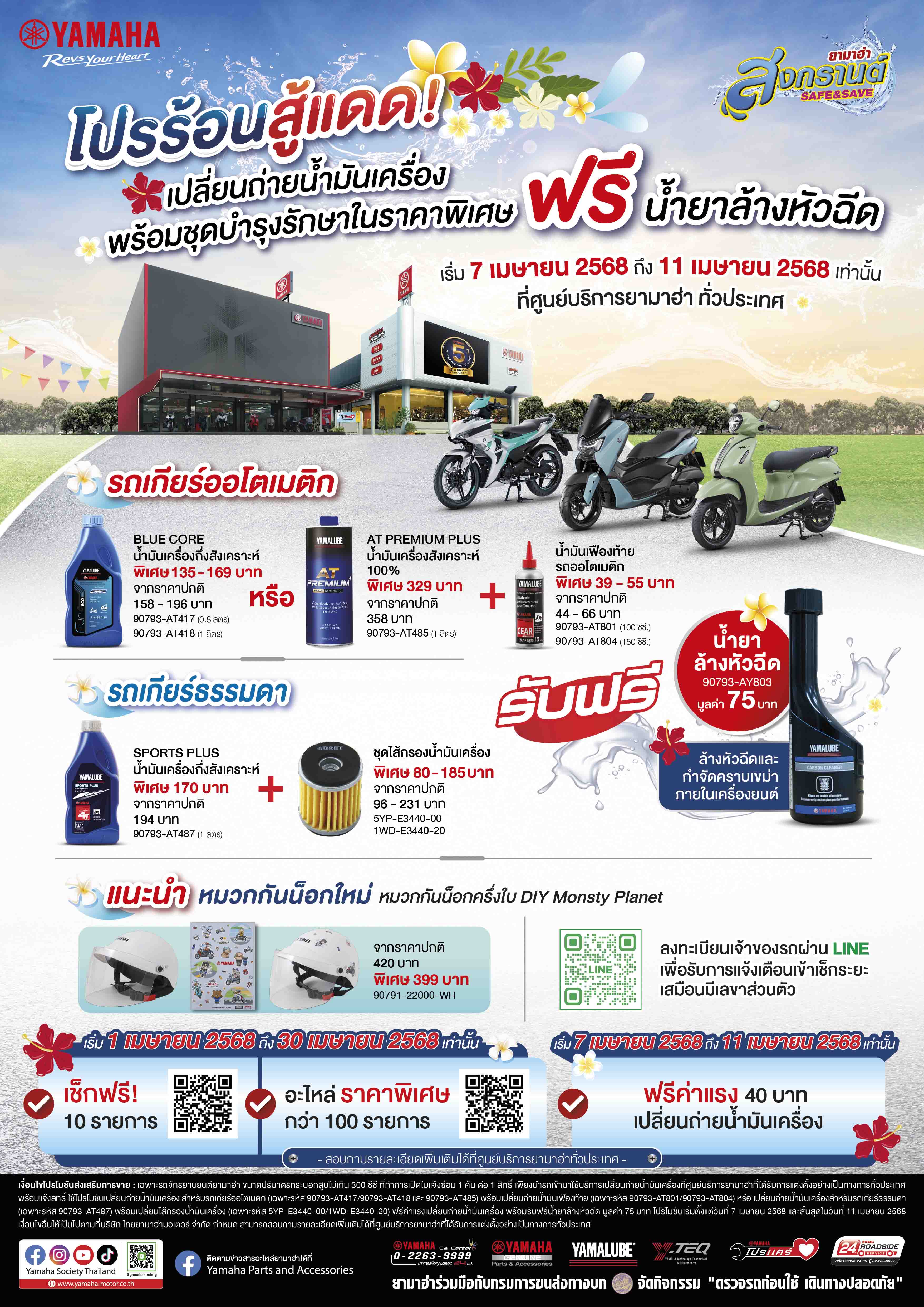บริษัท ไทยยามาฮ่ามอเตอร์ จำกัด จัดแคมเปญสุดพิเศษ “สงกรานต์ SAFE & SAVE” เตรียมรถให้พร้อมก่อนเดินทางวันสงกรานต์ มอบให้เป็นของขวัญกับลูกค้าที่ใช้รถจักรยานยนต์ยามาฮ่าในช่วงเทศกาลปีใหม่ไทย พร้อมด้วยโปรโมชัน “โปรร้อนสู้แดด” เปลี่ยนถ่ายน้ำมันเครื่อง พร้อมชุดบำรุงรักษาในราคาพิเศษ และมอบฟรี! น้ำยาล้างหัวฉีด เริ่มวันที่ 7 เมษายน – 11 เมษายน 2568 เท่านั้น ที่ศูนย์บริการยามาฮ่า ทั่วประเทศ