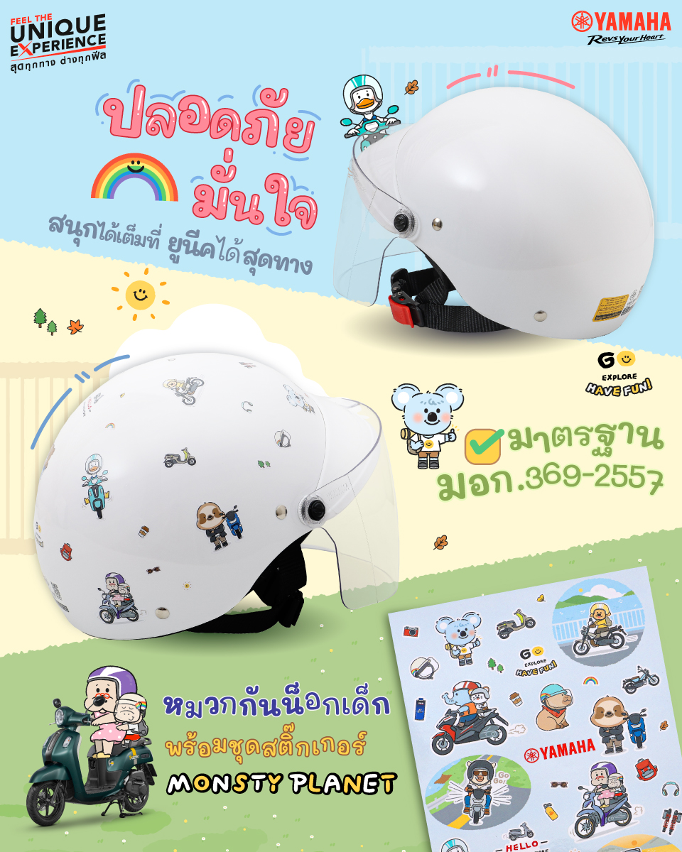 บริษัท ไทยยามาฮ่ามอเตอร์ จำกัด ร่วมเฉลิมฉลองครบรอบ 70 ปี ยามาฮ่ามอเตอร์ ประเทศญี่ปุ่น ด้วยการส่งมอบความพิเศษอีกครั้งกับ หมวกกันน็อกเด็ก Yamaha Monsty Planet DIY ที่ให้คุณหนูๆ ได้ปลดปล่อยไอเดียสุดเจ๋ง สร้างสรรค์ลวดลายหมวกกันน็อกของตัวเองที่ไม่เหมือนใคร! เพิ่มความสนุกและมั่นใจในทุกการเดินทางด้วยรถจักรยานยนต์ยามาฮ่า ที่มาพร้อมแนวคิด "ปลอดภัย มั่นใจ สนุกได้เต็มที่!"