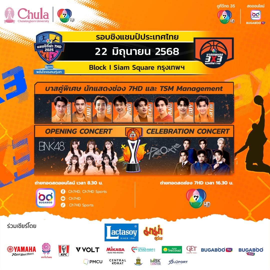 ห้ามพลาด! เตรียมพบกับ 8 ทีมบาสเกตบอลนักเรียนชายสุดแกร่ง ที่ผ่านการคัดเลือกระดับภูมิภาค มาระเบิดความมันส์และประชันฝีมือกันแบบแบทเทิลสุดเดือด! ณ ลาน Block I สยามสแควร์ ใจกลางกรุงเทพมหานคร วันอาทิตย์ที่ 22 มิถุนายน 2568 พร้อมร่วมชมและเชียร์ฟรีติดขอบสนามได้ที่ลาน Block I สยามสแควร์ หรือรับชมการถ่ายทอดสดทุกคู่ ผ่านช่องทาง Facebook และ YouTube Ch7HD รวมถึง Facebook และ TikTok Ch7HD Sports พิเศษสุด! คู่ชิงชนะเลิศ เตรียมยิงสด! ทางหน้าจอช่อง 7HD กด 35 ตั้งแต่เวลา 16.30 น. เป็นต้นไป