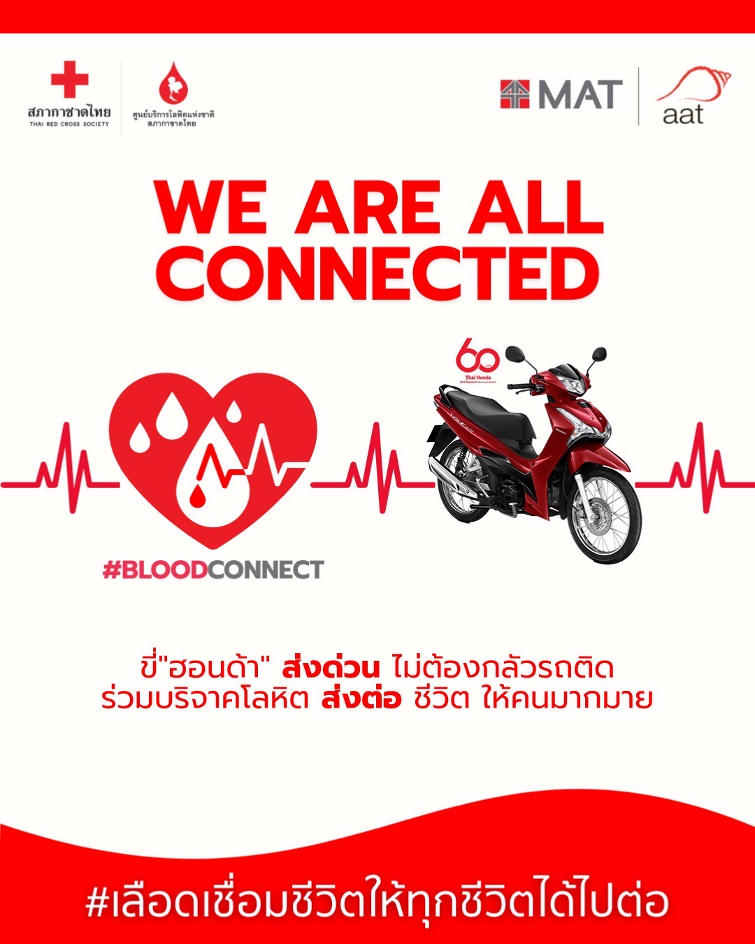 รถจักรยานยนต์ฮอนด้า ร่วมเป็นส่วนหนึ่งในการส่งต่อสิ่งดี ๆ สู่สังคม ผ่านการสนับสนุนโครงการ “We Are All Connected – เลือดเชื่อมชีวิตให้ทุกชีวิตได้ไปต่อ” โครงการสื่อสารการตลาดเพื่อสังคมที่เกิดจากความร่วมมือของ สมาคมการตลาดแห่งประเทศไทย สมาคมโฆษณาแห่งประเทศไทย และสมาคมมีเดียเอเจนซี่และธุรกิจสื่อแห่งประเทศไทย โดยมีเป้าหมายเพื่อระดมพลังจากทุกภาคส่วน สร้างการรับรู้เรื่องการบริจาคโลหิต และชวนคนไทยไปบริจาคเลือดที่จุดรับบริจาคใกล้บ้าน