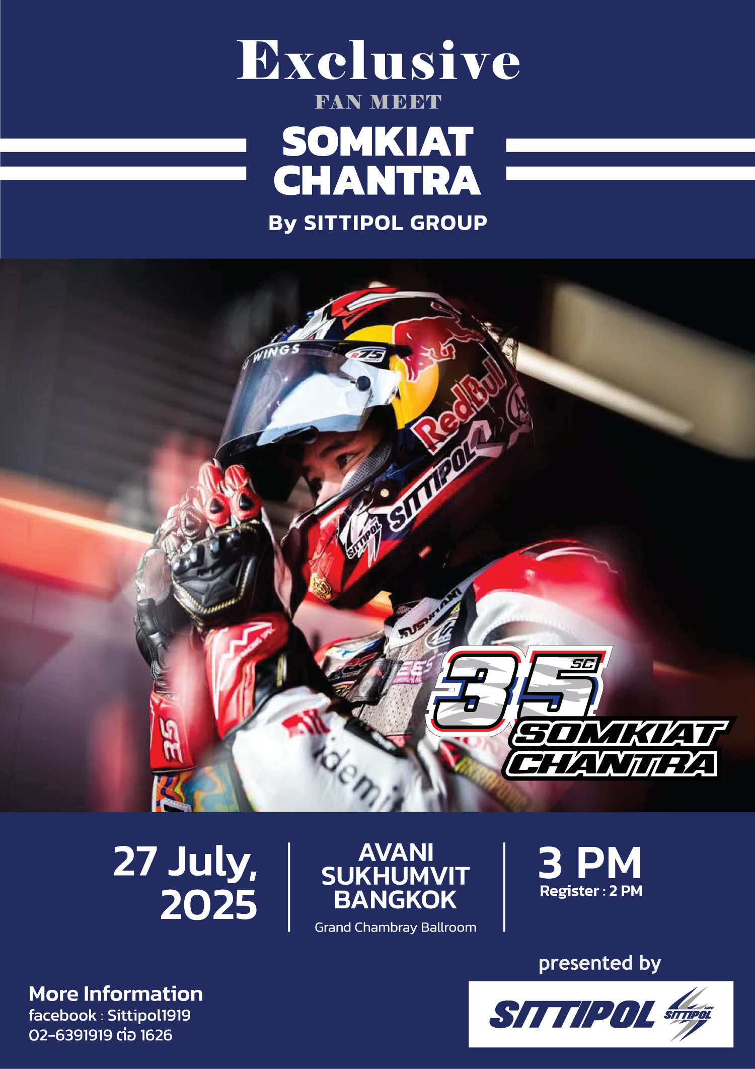 สามารถติดตามกิจกรรม Exclusive Fan Meet Somkiat Chantra by Sittipol Group วันที่ 27 กรกฎาคม 2568 ณ โรงแรมอวานี สุขุมวิท กรุงเทพฯ ได้ที่ Facebook: Sittipol 1919