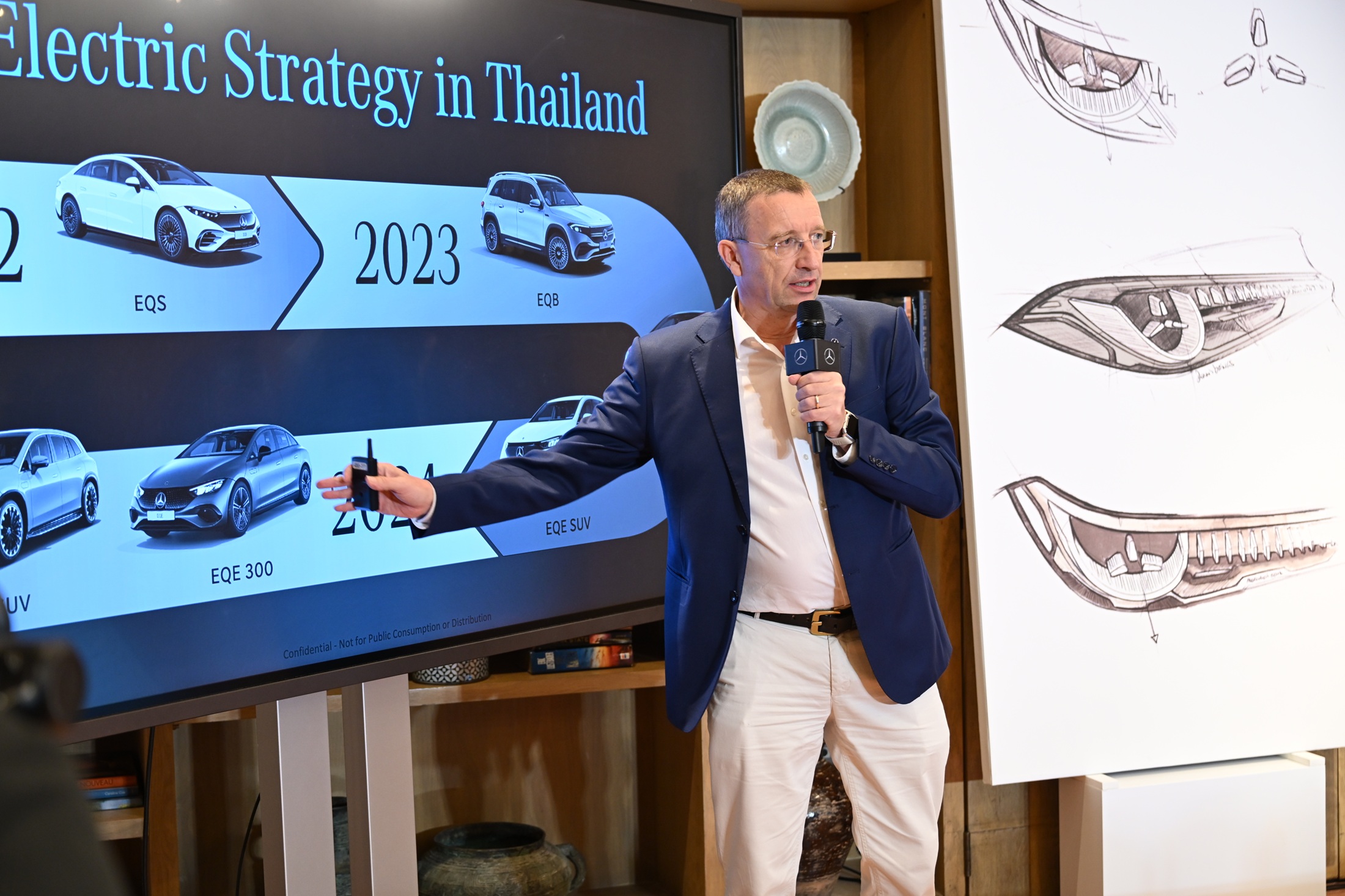 มร. มาร์ทิน ชเวงค์ ประธานเจ้าหน้าที่บริ หารและกรรมการผู้จัดการใหญ่ บริษัท เมอร์เซเดส-เบนซ์ (ประเทศไทย) จำกัด กล่าวว่า “สำหรับการทำตลาดรถยนต์พลั งงานไฟฟ้า 100% เมอร์เซเดส-เบนซ์ ประเทศไทย ได้มีการใช้กลยุทธ์ที่แตกต่ างจากประเทศอื่นๆ โดยเริ่มต้นด้วยการนำรุ่นแฟลกชิ ปในเซกเมนต์ Top-End Luxury อย่าง EQS มาเปิดตัวครั้งแรกในปี 2565 ทั้งรุ่นนำเข้าและรุ่ นประกอบในประเทศ เพื่อทำให้คนไทยได้สัมผัสกับขั้ นสุดของรถยนต์พลังงานไฟฟ้าระดั บโลกจากเมอร์เซเดส-เบนซ์ ก่อนที่ในปี 2566–2567 จะเริ่มเปิดตัวรถยนต์ในเซกเมนต์ Entry Luxury อย่าง EQB 250 ที่ได้รับการตอบรับเป็นอย่างดี จนไปถึงการเปิดตัว EQE 350 4MATIC SUV, EQE 53 4MATIC+, EQE 300 และ EQS 450 4MATIC SUV ตามลำดับ ซึ่งจากระยะเวลาที่ผ่านมาจนถึ งปัจจุบัน เมอร์เซเดส-เบนซ์ มีความเข้าใจในโจทย์และความพร้ อมของผู้บริโภคชาวไทยสำหรั บการใช้งานรถยนต์พลังงานไฟฟ้ าเป็นอย่างดี