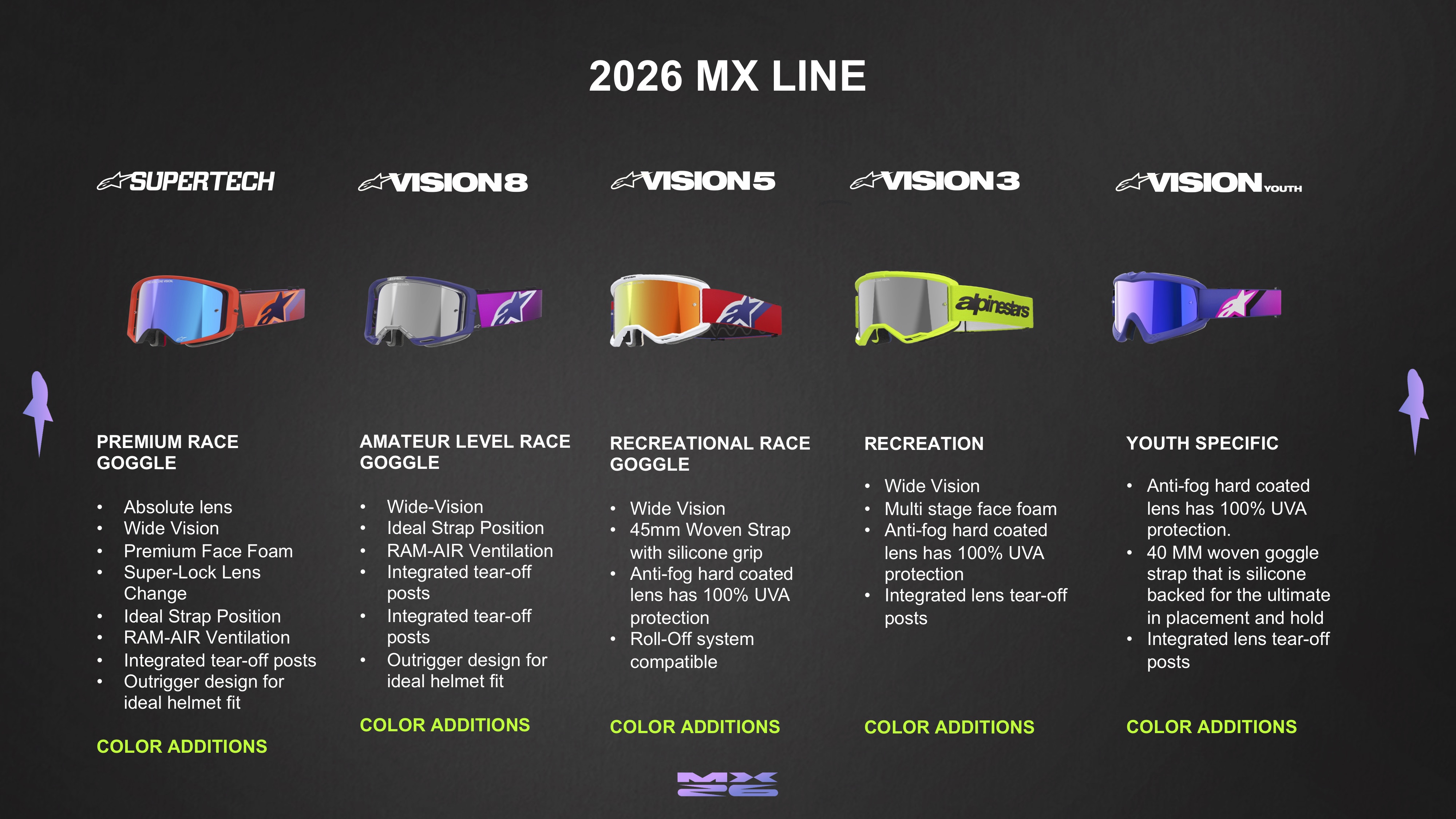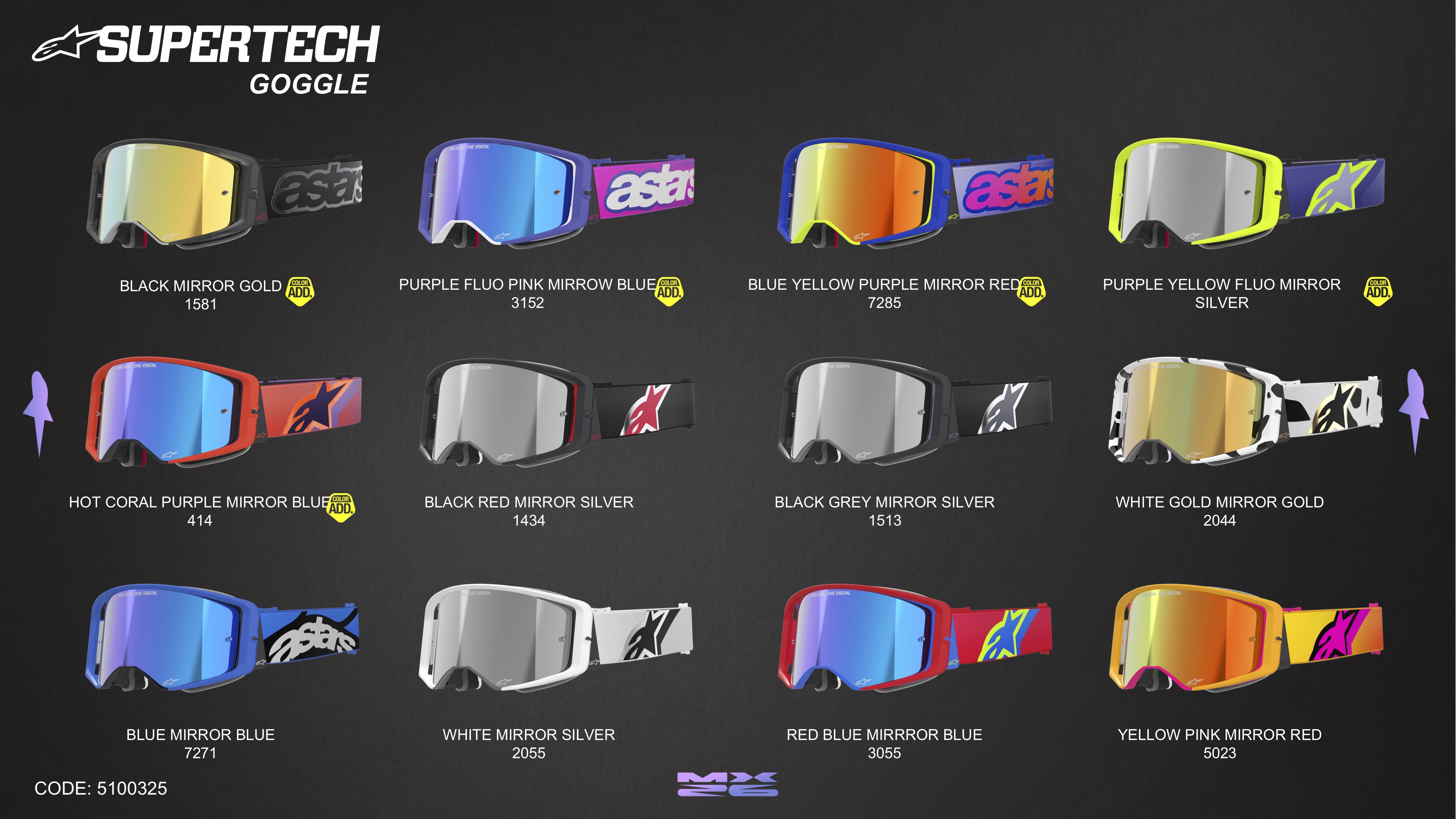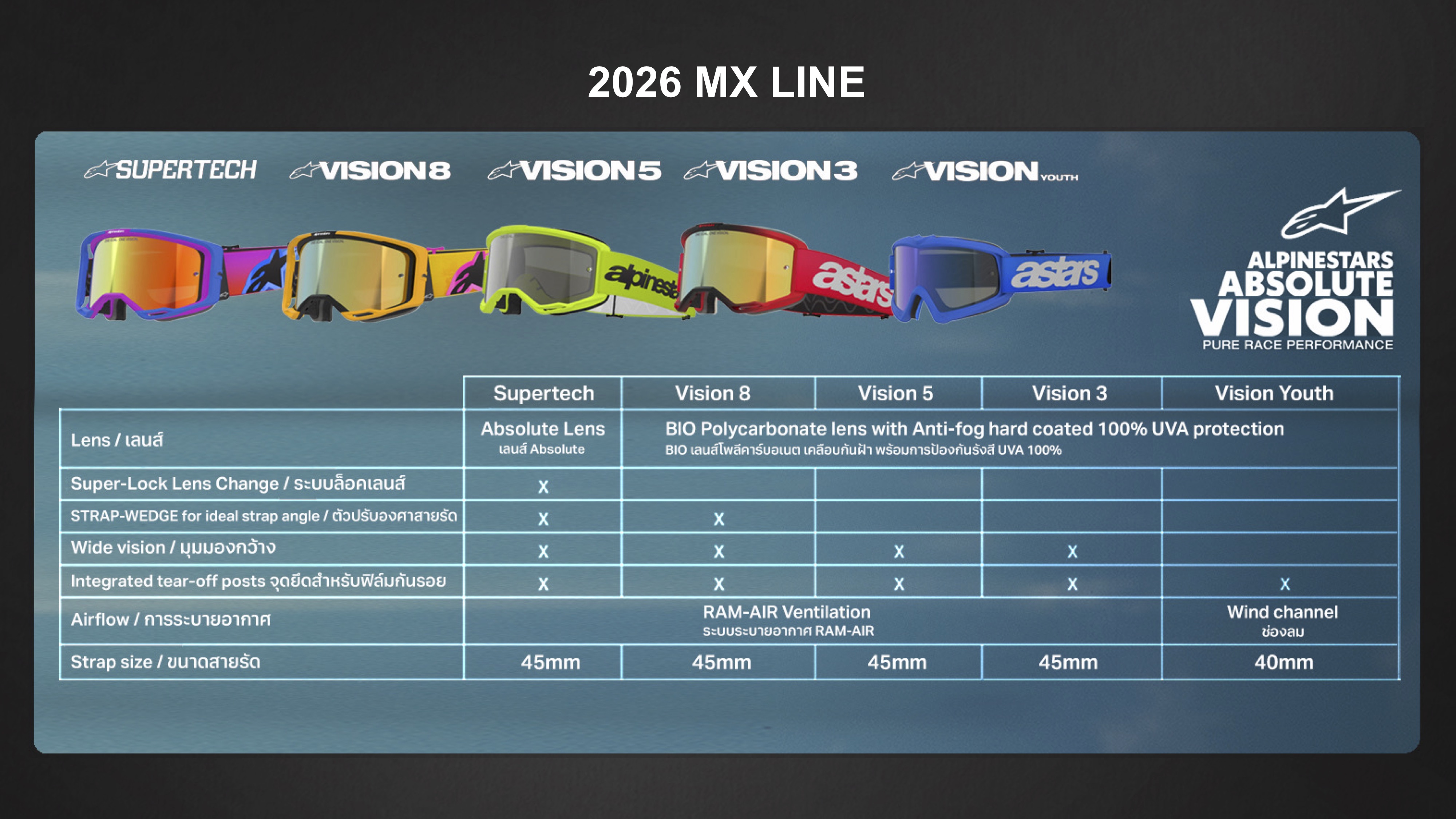 Alpinestars (อัลไพน์สตาร์ส) แบรนด์อุปกรณ์มอเตอร์สปอร์ตชั้นนำระดับโลก มีประวัติยาวนานมากว่า 60 ปีในวงการมอเตอร์สปอร์ต เปิดตัวแว่นตาโมโตครอส ภายใต้คอนเซปท์ “World-class innovation meets the next generation of goggle technology” ทั้งนี้ บริษัท เพซแม็กซ์ มอเตอร์สปอร์ต จำกัด ผู้นำเข้าและตัวแทนจัดจำหน่ายอุปกรณ์ขับขี่ เครื่องแต่งกาย Alpinestars สัญชาติอิตาลี ได้เปิดตัวแว่นตาโมโตครอสอย่างเป็นทางการครั้งแรกในประเทศไทย โดยวางจำหน่ายด้วยกัน 5 รุ่น ได้แก่ Supertech, Vision 8, Vision 5, Vision 3 และ Vision Youth Goggles ด้วยราคาเริ่มต้นเพียง 890 บาท