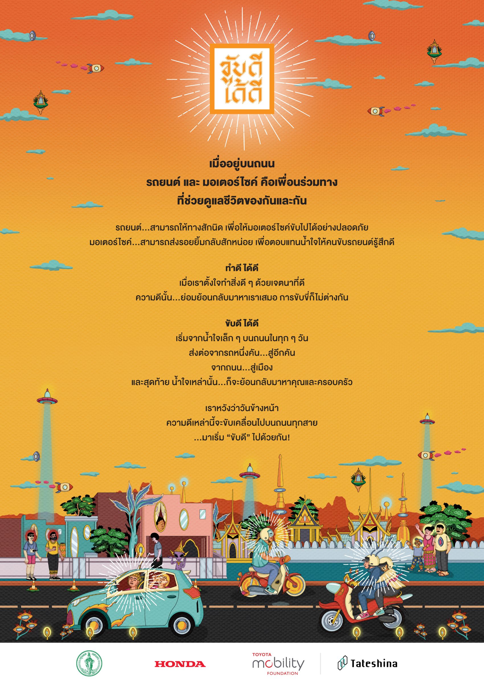 ทั้งนี้ TMF และ Honda ได้ร่วมมือกันภายใต้คณะอนุกรรมการด้านต่างประเทศของกรอบความร่วมมือระหว่างอุตสาหกรรม “Tateshina Meeting” เพื่อมุ่งสู่เป้าหมาย “การสูญเสียจากอุบัติเหตุทางถนนเป็นศูนย์” ทั้งสององค์กรได้แบ่งปันองค์ความรู้และประสบการณ์จากโครงการด้านความปลอดภัยทางถนนที่ดำเนินการในประเทศญี่ปุ่น เพื่อนำมาประยุกต์และขยายผลสู่ระดับสากล เพื่อสร้างสภาพแวดล้อมการจราจรที่ปลอดภัยมากยิ่งขึ้น ภายใต้ความร่วมมือนี้ ทั้งสององค์กรเตรียมดำเนินแคมเปญในประเทศไทย ภายใต้แนวคิดที่ได้รับอิทธิพลจากวัฒนธรรมความเชื่อของไทย “ทำดีได้ดี (TAM-DEE-DAI-DEE / Good Deeds Bring Good Returns)” เพื่อส่งเสริมพฤติกรรมการขับขี่ที่ดีและลดอุบัติเหตุทั้งจากรถยนต์และรถจักรยานยนต์ พร้อมทั้งมีการติดตามและประเมินผลลัพธ์ของแคมเปญ เพื่อพัฒนาแนวทางด้านความปลอดภัยทางถนนให้ดียิ่งขึ้นต่อไป