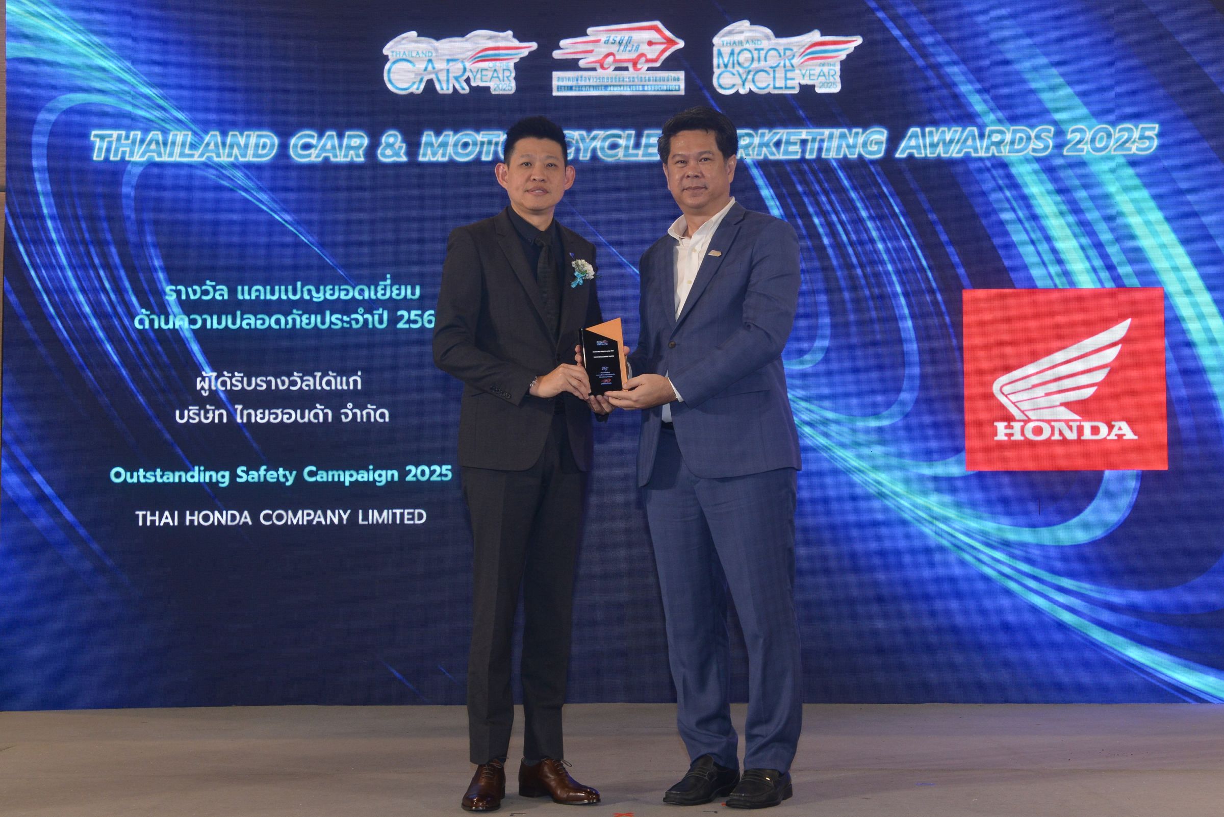 รถจักรยานยนต์ฮอนด้าได้รับรางวัล Outstanding Safety Campaign 2025 แคมเปญยอดเยี่ยมด้านความปลอดภัย ประจำปี 2568 จากงานประกาศผลรางวัล “Thailand Car, EV & Motorcycle of The Year 2025” จัดโดยสมาคมผู้สื่อข่าวรถยนต์และรถจักรยานยนต์ไทย (สรยท.) ซึ่งถือเป็นอีกหนึ่งความภาคภูมิใจที่สะท้อนถึงความมุ่งมั่นของไทยฮอนด้าในการยกระดับความปลอดภัยทางถนนอย่างต่อเนื่อง โดยมี นายนคร วิมลจิตรสอาด ผู้จัดการทั่วไป สายงานการสื่อสารการตลาด บริษัท ไทยฮอนด้า จำกัด เป็นผู้แทนรับมอบรางวัลในพิธีดังกล่าว