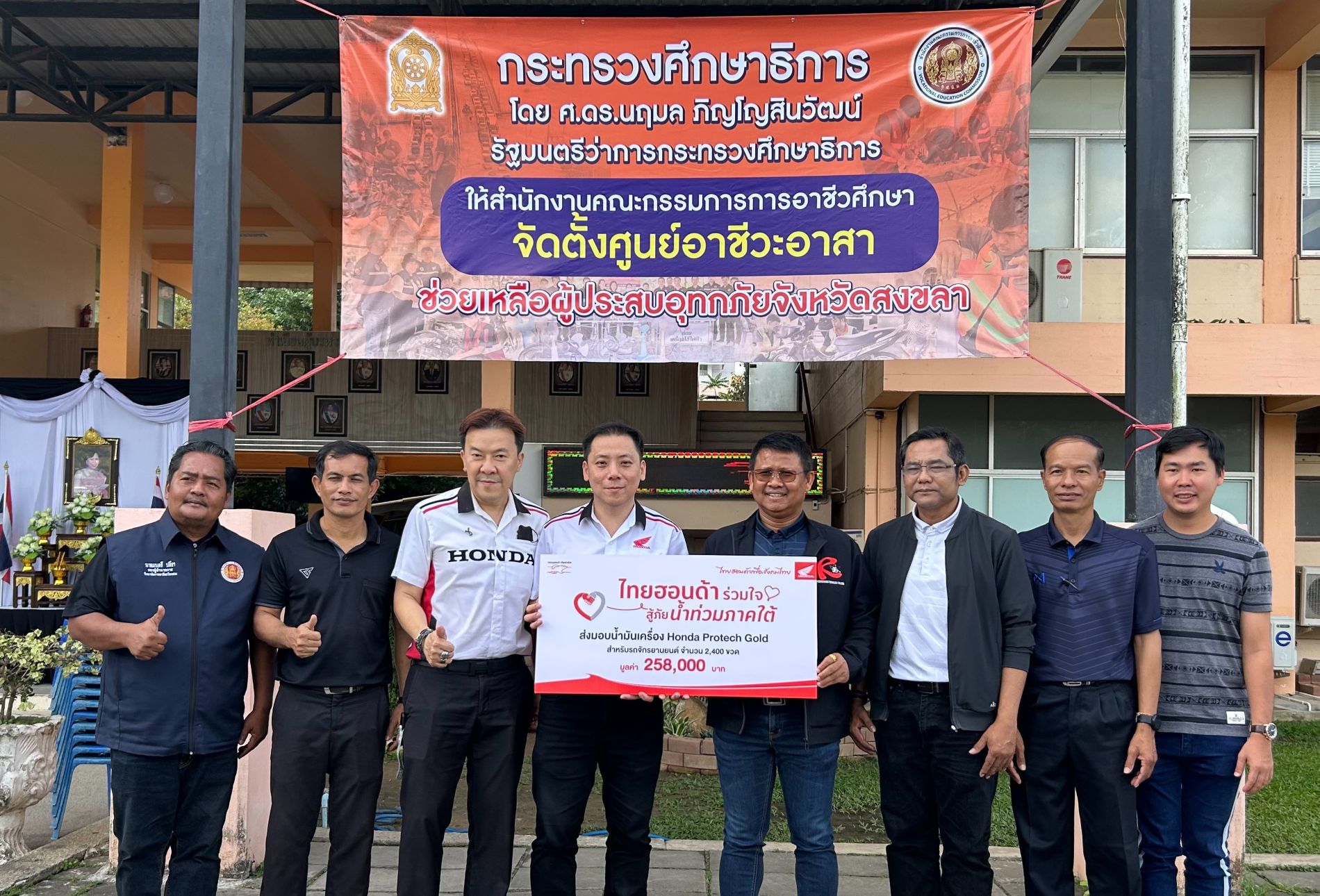 การส่งมอบน้ำมันเครื่องครั้งนี้ ดร.อารักษ์ พรประภา ประธาน บริษัท ไทยฮอนด้า จำกัด เป็นผู้มอบให้ไทยพีบีเอส โดย นายสมชัย พุทธจันทรา รองผู้อำนวยการ ส.ส.ท. ด้านสร้างสรรค์เนื้อหา เป็นผู้รับมอบ น้ำมันเครื่องเครื่องกว่า 200 ลัง จำนวน 2,400 ขวด และได้ทำการส่งตรงถึงสำนักงานคณะกรรมการการอาชีวศึกษา เมื่อวันที่ 7 ธันวาคมนี้ ที่ผ่านมา ณ วิทยาลัยเทคนิคหาดใหญ่ เพื่อกระจายให้กับศูนย์ฯ ต่างๆ ในจังหวัดสงขลา กว่า 50 แห่ง ซึ่งน้ำมันเครื่องเหล่านี้ ถือเป็นส่วนสำคัญ ที่จะช่วยให้เด็กๆ อาชีวศึกษา ซ่อมรถจักรยานยนต์ ให้ผู้ประสบภัยนำมาใช้งานในชีวิตประจำวัน หรือ ประกอบอาชีพ ต่อไปได้