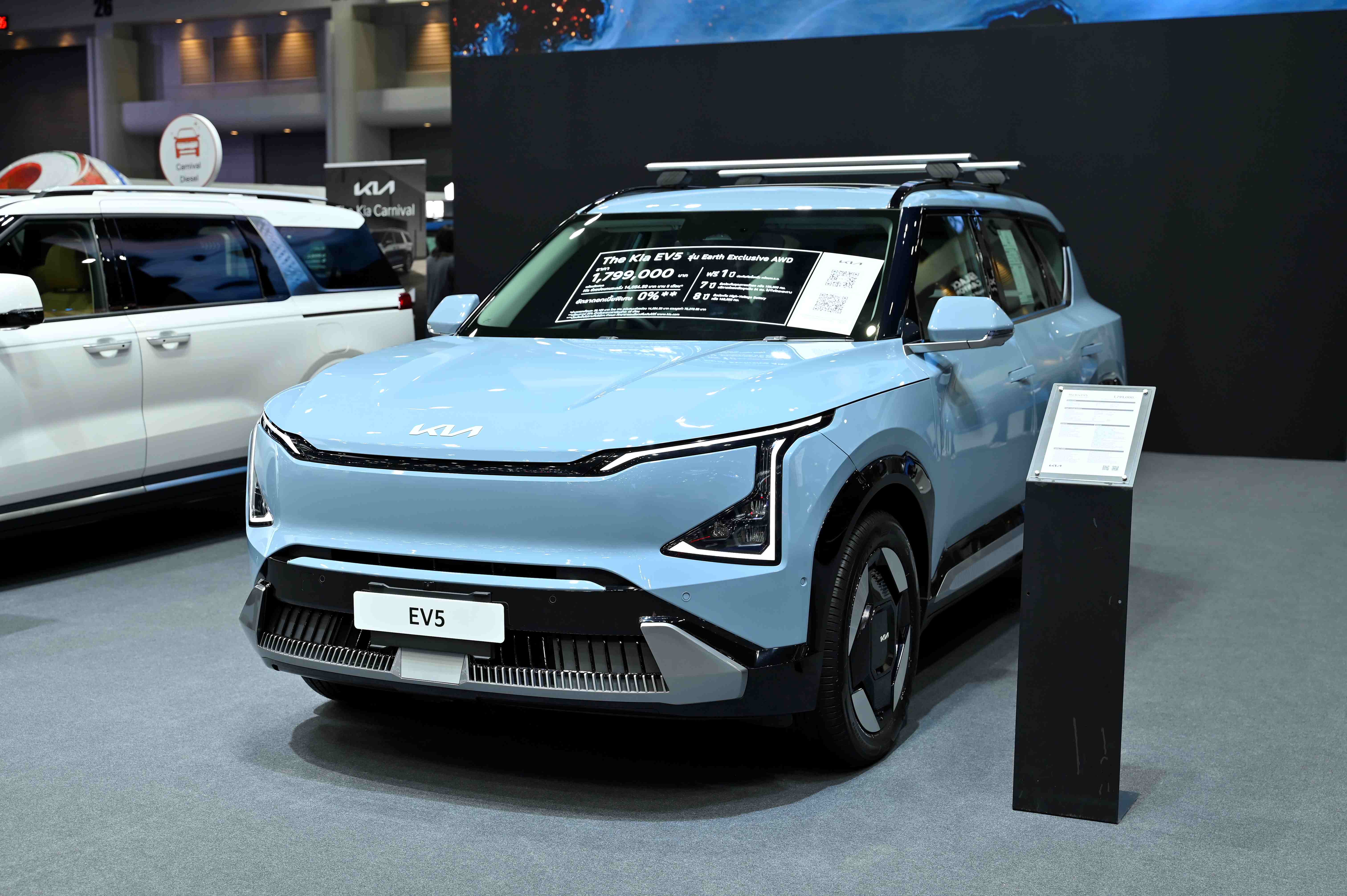 The Kia EV5 – SUV ขนาดกลางไฟฟ้า 100% – โดดเด่นด้วยการตกแต่งภายในที่กว้างขวาง ดีไซน์ทันสมัย ลักษณะการขับขี่แบบไดนามิก และความอเนกประสงค์เต็มรูปแบบ ตอบสนองทุกไลฟ์สไตล์ของครอบครัวยุคใหม่ได้อย่างสมบูรณ์แบบ มีให้เลือก 4 รุ่นย่อย ได้แก่ The Kia EV5 Air, The Kia EV5 Earth Long Range, The Kia EV5 Earth Exclusive AWD และ The Kia EV5 GT-Line AWD