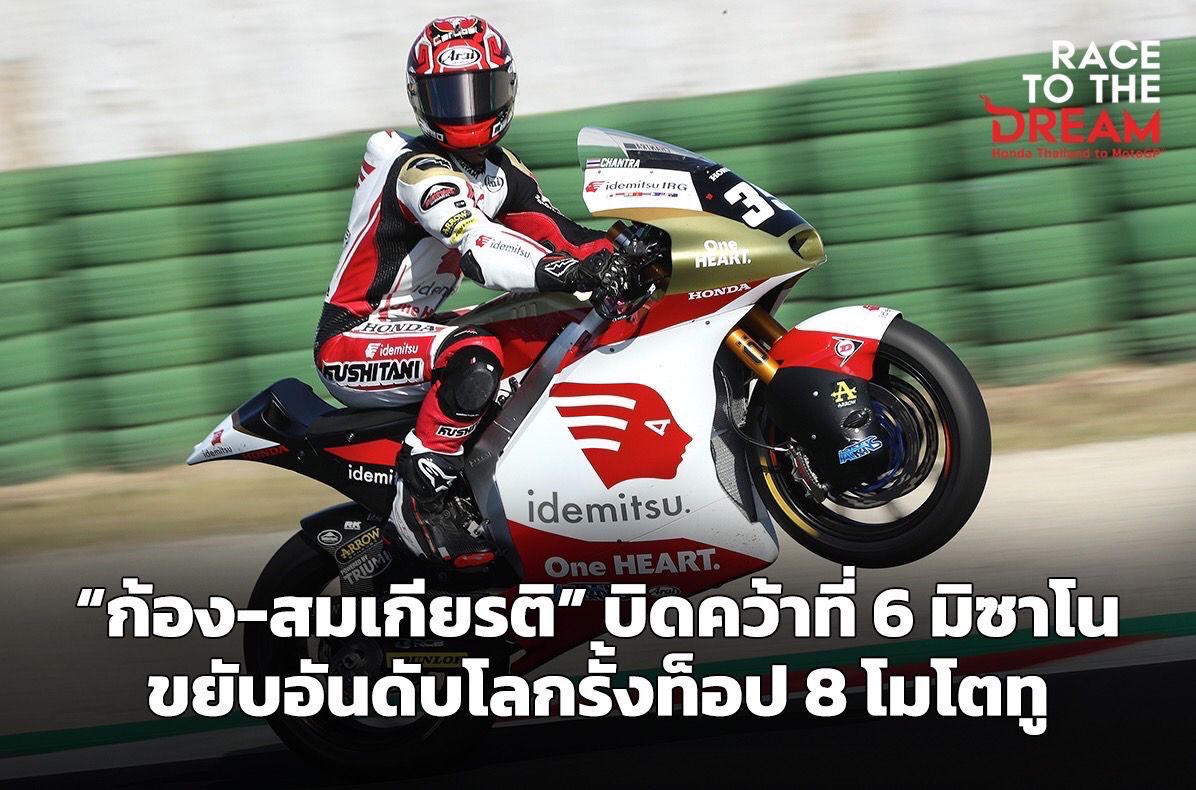 “ก้อง” สมเกียรติ จันทรา ยอดนักบิดไทยจากโครงการ “ฮอนด้า เรซ ทู เดอะ ดรีม” ไล่แซงคู่แข่งอย่างดุเดือดบิดคว้าอันดับ 6 ในศึก โมโตทู เวิลด์ แชมเปี้ยนชิพ 2023 สนาม 12 ที่ มิซาโน ประเทศอิตาลี เมื่ออาทิตย์ที่ 10 กันยายนที่ผ่านมา พร้อมเก็บแต้มสำคัญขยับอันดับโลกขึ้นมารั้งอันดับ 8 หลังดวลความเร็วสุดมันส์
