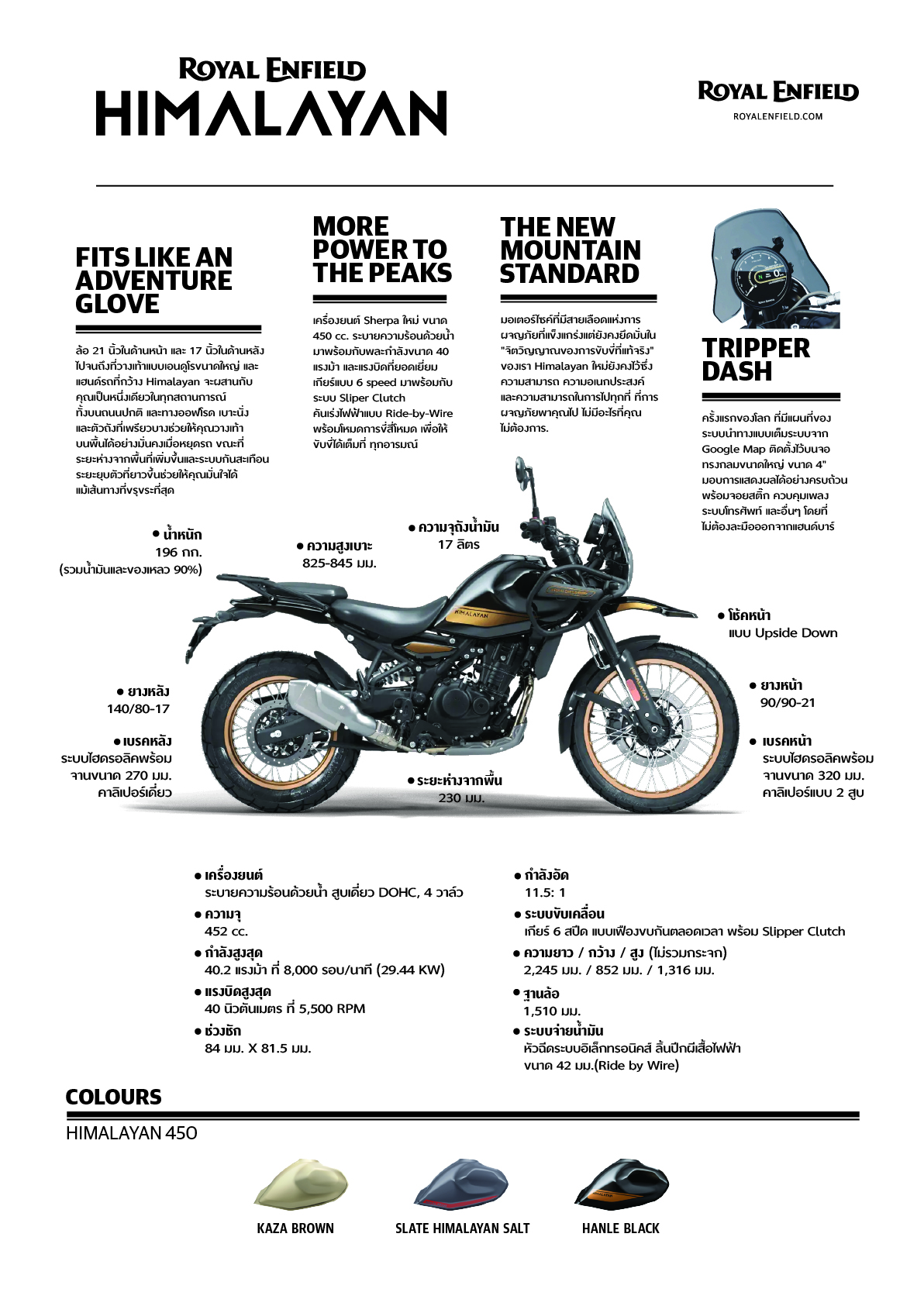 Royal Enfield (โรยัล เอ็นฟีลด์) ผู้นำตลาดรถจักรยานยนต์ขนาดกลางระดับโลก (250 ซีซี - 750 ซีซี) ได้เปิดตัว THE ALL-NEW HIMALAYAN ที่งาน Bangkok International Motor Show 2024 โดยครั้งนี้ Royal Enfield ได้พลิกโฉมระบบขับเคลื่อนให้กับ THE ALL-NEW HIMALAYAN รุ่นล่าสุดนี้ด้วยระบบเครื่องยนต์ระบายความร้อนด้วยน้ำSherpa 450 ใหม่ ที่ควบรวมกับฟีเจอร์เทคโนโลยีอีกมากมาย ช่วยยกระดับการเดินทางผจญภัย พร้อมสร้างประสบการณ์การขับขี่ให้กับนักบิดสายลุยได้สนุกกับทุกโค้ง ทุกถนน กับตัวเครื่องที่เบาที่สุด และล้ำสมัยที่สุดของ Royal Enfield โดย Royal Enfield - THE ALL-NEW HIMALAYAN เตรียมวางจำหน่ายอย่างเป็นทางการในประเทศไทยภายในสิ้นปี 2567 นี้แน่นอน ซึ่งมาพร้อมกับ 3 เฉดสี ได้แก่ HANLE BLACK, KAZA BROWN, และ SLATE HIMALAYAN SALT