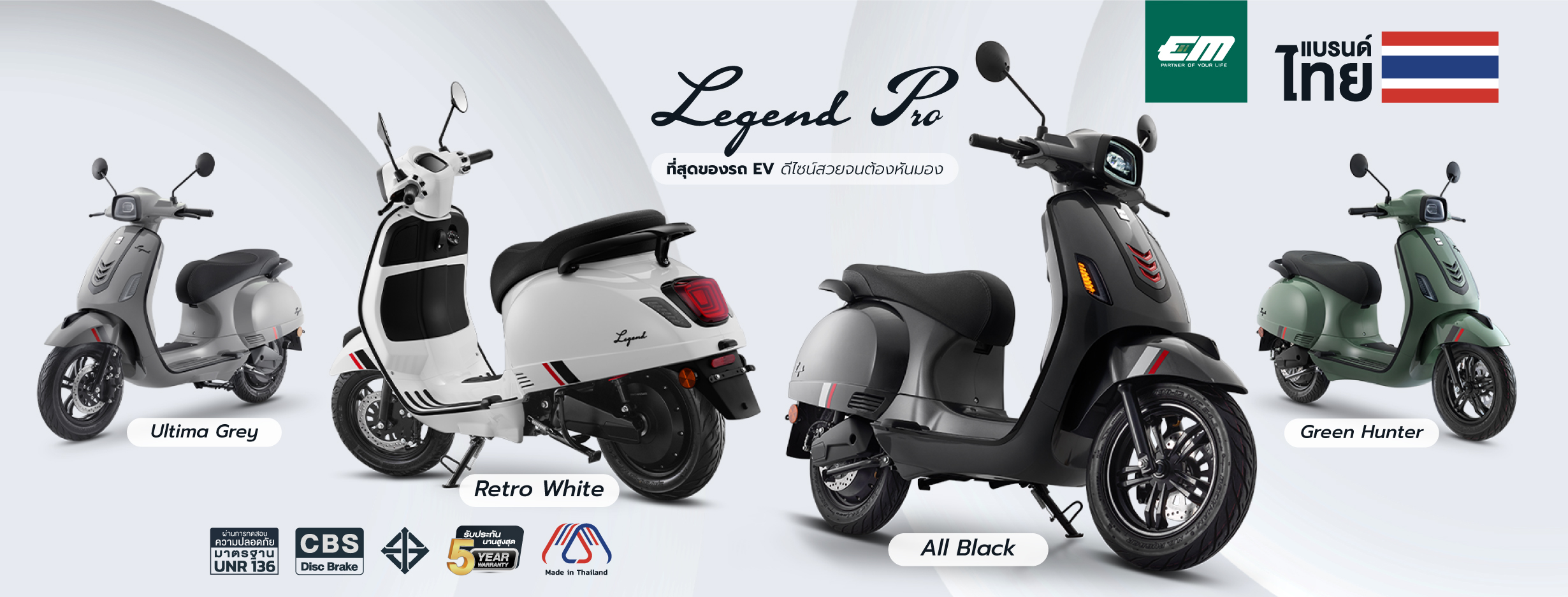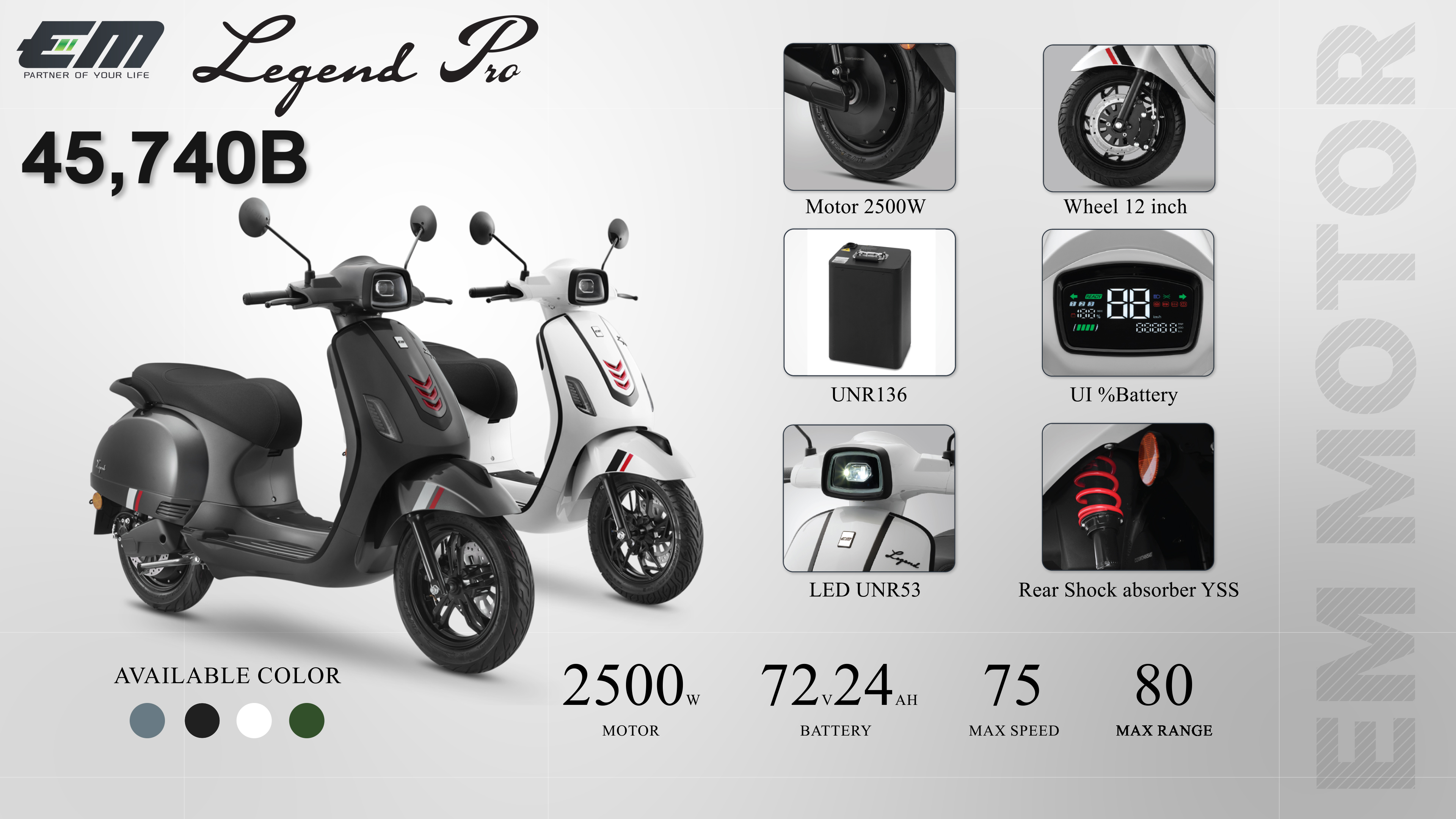 การเปิดตัว “EM Legend Pro” เป็นอีกหนึ่งหมุดหมายสำคัญของ EM Motor ในการพัฒนาไปข้างหน้าอย่างเข้มแข็ง สะท้อนถึงวิสัยทัศน์ขององค์กรที่มุ่งมั่นสร้างแบรนด์ไทย ก้าวสู่ความเป็นผู้นำในตลาด EV ด้วยจุดยืนที่ชัดเจนด้านการออกแบบนวัตกรรมที่ตอบโจทย์การใช้งานและการส่งมอบประสบการณ์ขับขี่ที่มีความปลอดภัย มีสมรรถณะการขับขี่ที่มีมาตรฐาน ประหยัดพลังงานและราคาเข้าถึงง่ายสำหรับคนไทยทุกกลุ่ม