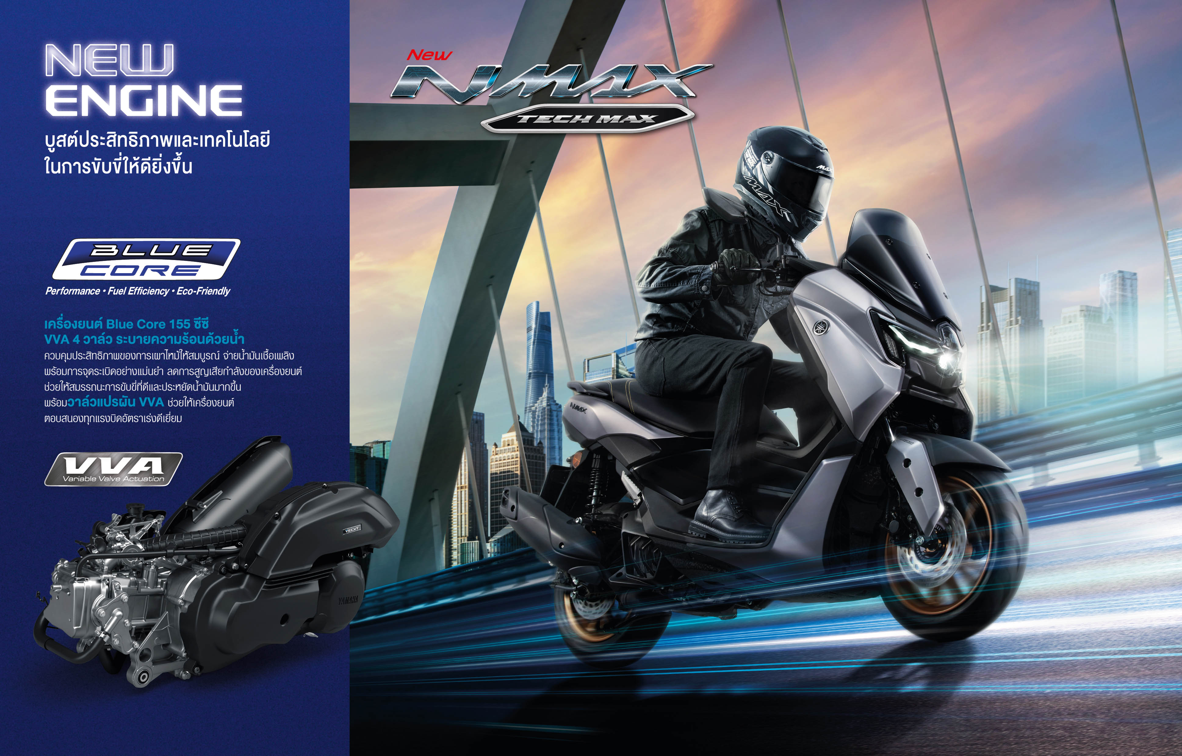 MAX PERFORMANCE บูสต์อารมณ์เทอร์โบ…ด้วยสมรรถนะระดับพรีเมียมของเครื่องยนต์ BLUE CORE 155 cc VVA 4 วาล์ว ระบายความร้อนด้วนน้ำ ควบคุมประสิทธิภาพของการเผาไหม้ได้อย่างสมบูรณ์ จ่ายน้ำมันเชื้อเพลิงพร้อมการจุดระเบิดอย่างแม่นยำ ลดการสูญเสียกำลังของเครื่องยนต์ เสริมสมรรถนะการขับขี่ที่ดี และประหยัดน้ำมันมากขึ้น พร้อมวาล์วแปรผัน VVA ช่วยให้เครื่องยนต์ตอบสนองทุกแรงบิดอัตราเร่งดีเยี่ยม